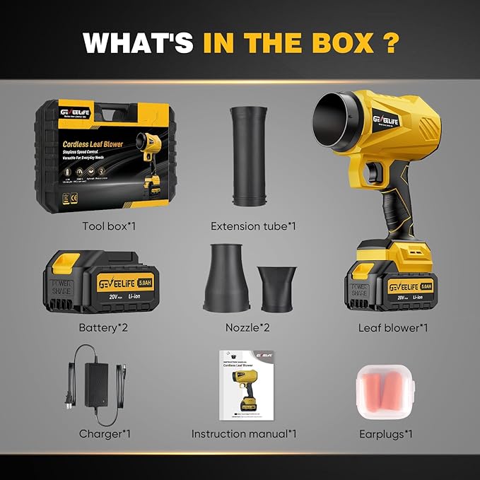 • 【Complete Package】Everything you need is included: 1 handheld cordless leaf blower main unit, 2 rechargeable 21V 5.0Ah batteries, 1 fast charger, and 3 versatile nozzles for customized cleaning.