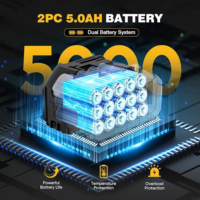 • 【Dual Battery & Fast Charging】Stay productive for longer with two included 5.0Ah high-capacity batteries and a fast charger. Enjoy up to 50 minutes of continuous operation—ideal for extended, large-area cleaning sessions. No more interruptions for frequent charging, saving you valuable time and effort.