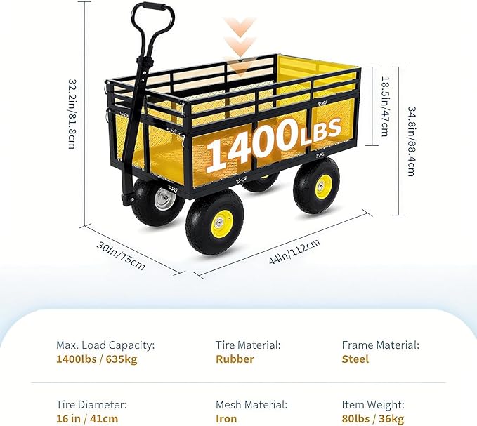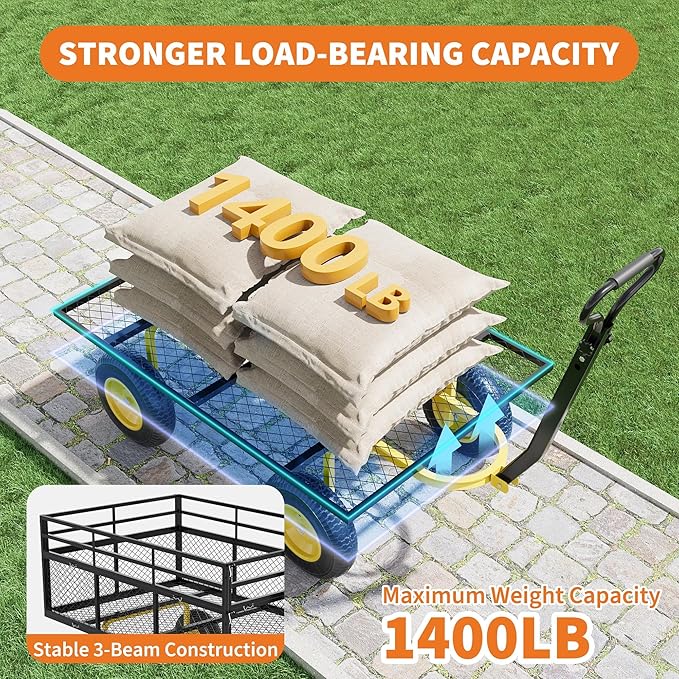 • Heavy-Duty Build Handles Up to 1400 lbs:Crafted from reinforced steel, this heavy duty garden cart offers a robust 500 lb capacity. The large mesh-sided bed improves airflow while reducing debris buildup, making cleanup effortless after transporting bulk materials or yard waste.