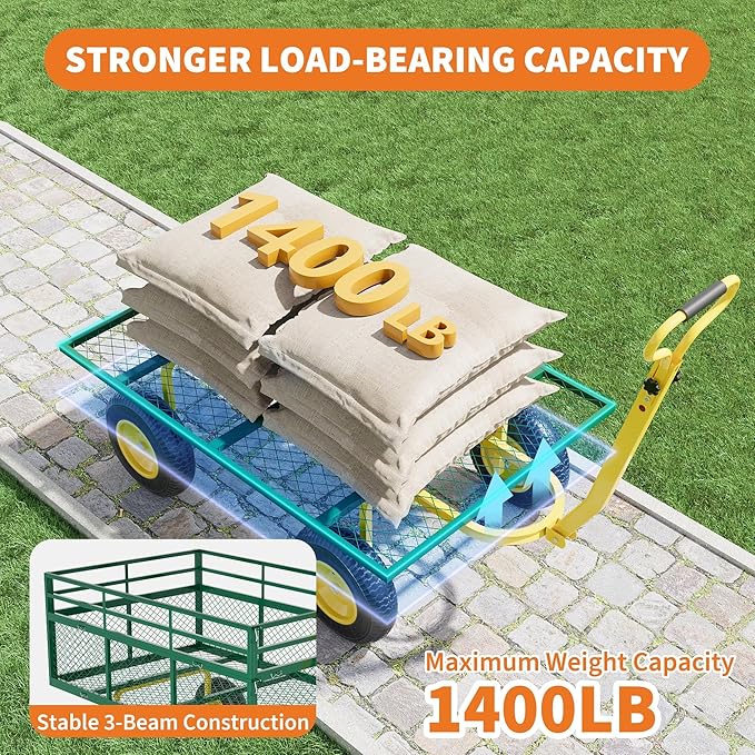 • Heavy-Duty Build Handles Up to 1400 lbs:Crafted from reinforced steel, this heavy duty garden cart offers a robust 500 lb capacity. The large mesh-sided bed improves airflow while reducing debris buildup, making cleanup effortless after transporting bulk materials or yard waste.