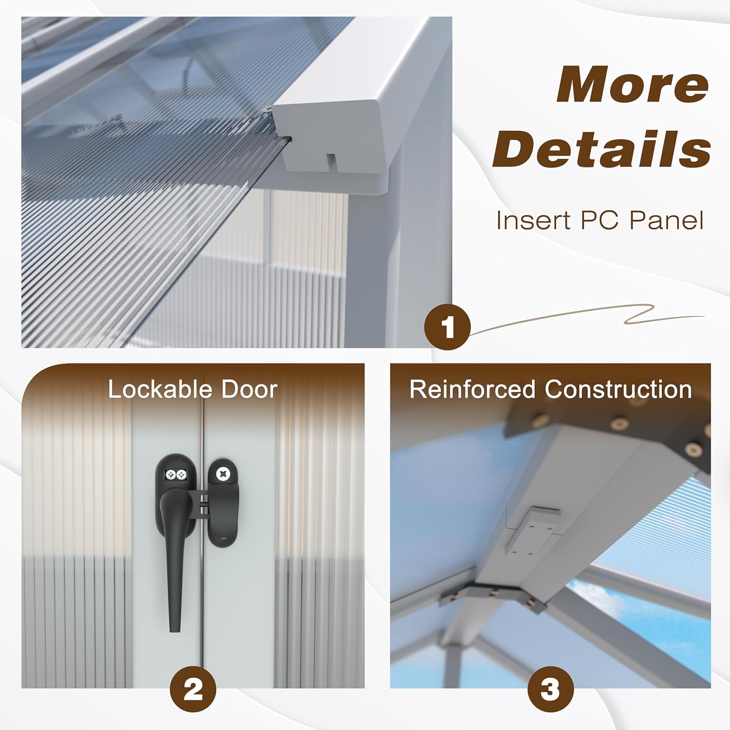 • Multi-Layer PC Panels – Constructed with multi-layered polycarbonate panels, this outdoor greenhouse offers excellent thermal insulation. The translucent panels block harmful UV rays while allowing up to 90% light transmission, giving plants the sunlight they need for strong, healthy growth.