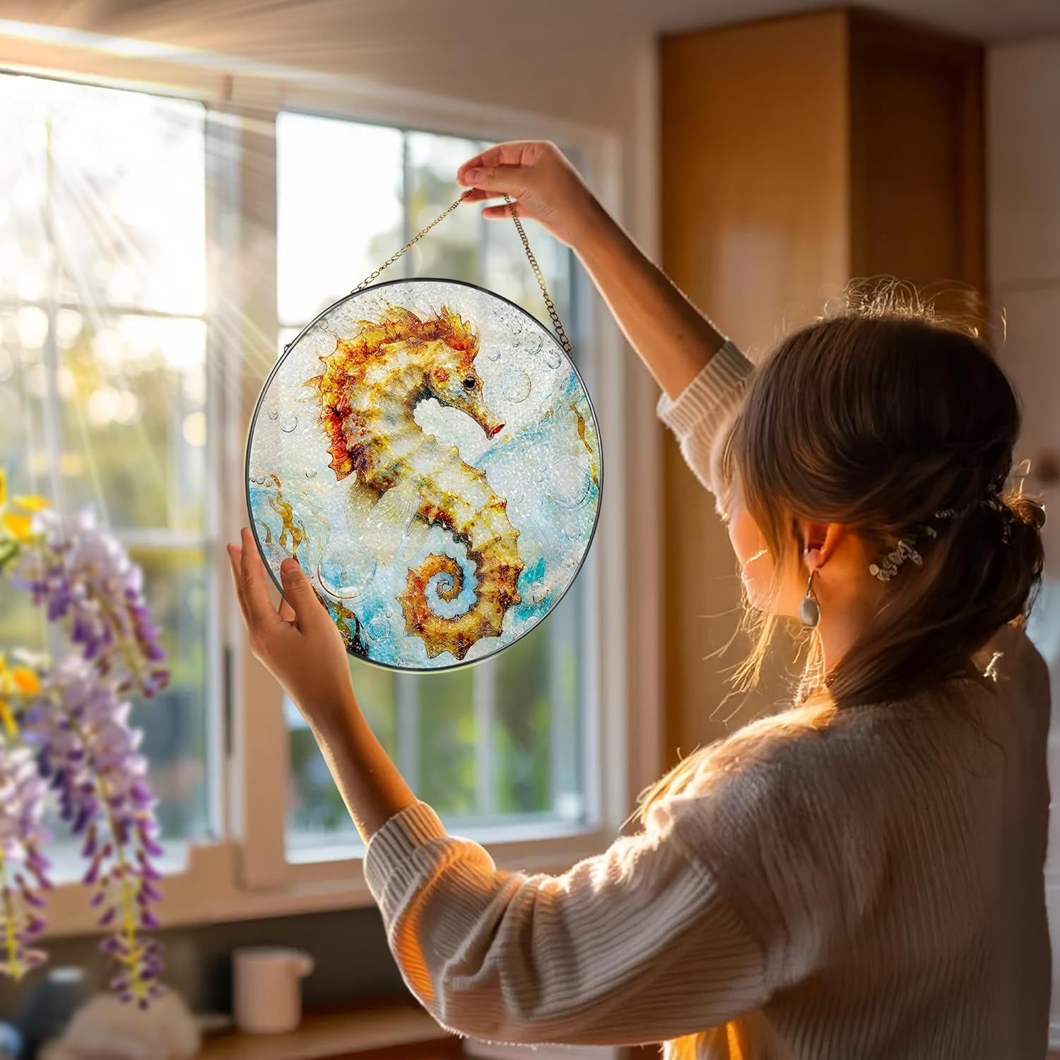 Stained Glass Window Hanging, 8 Inch Seahorse Sun Catcher Decor, Stained Glass Ornament, Suncatchers for Windows Hanging, Window Decor, Seahorse Gifts, Gifts for Ocean Lovers