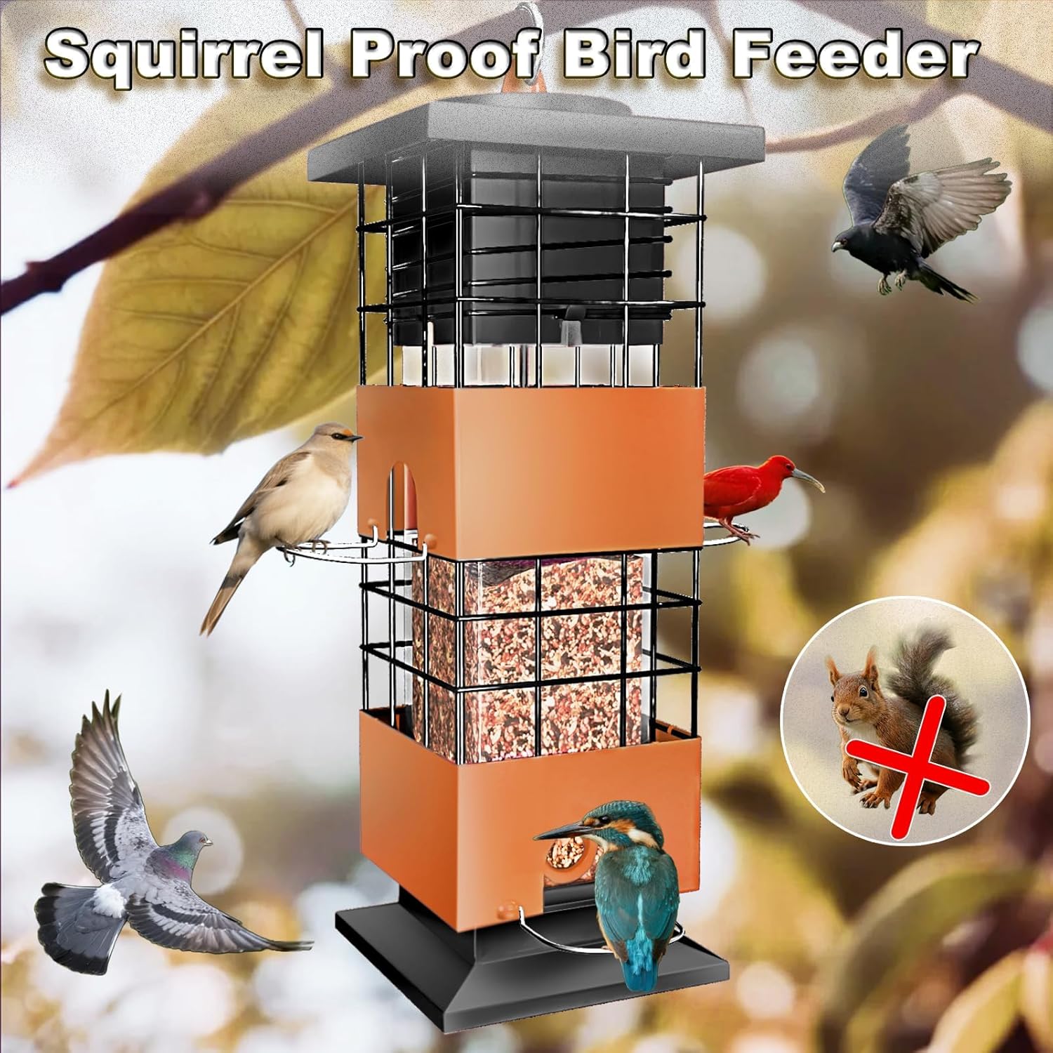 • Metal Squirrel Proof Bird Feeder: Our bird feeders for outdoors is made of metal, strong and long life. Grid design with a weight activated spring design, when the squirrel climbs the feeder, its weight will force the spring down and the feeding mouth will be covered, preventing away squirrels from reaching the seeds. But Some squirrels are smart to jump on the tray to eat the food, We recommend adding a squirrel baffle to the bird feeder top and bottom.