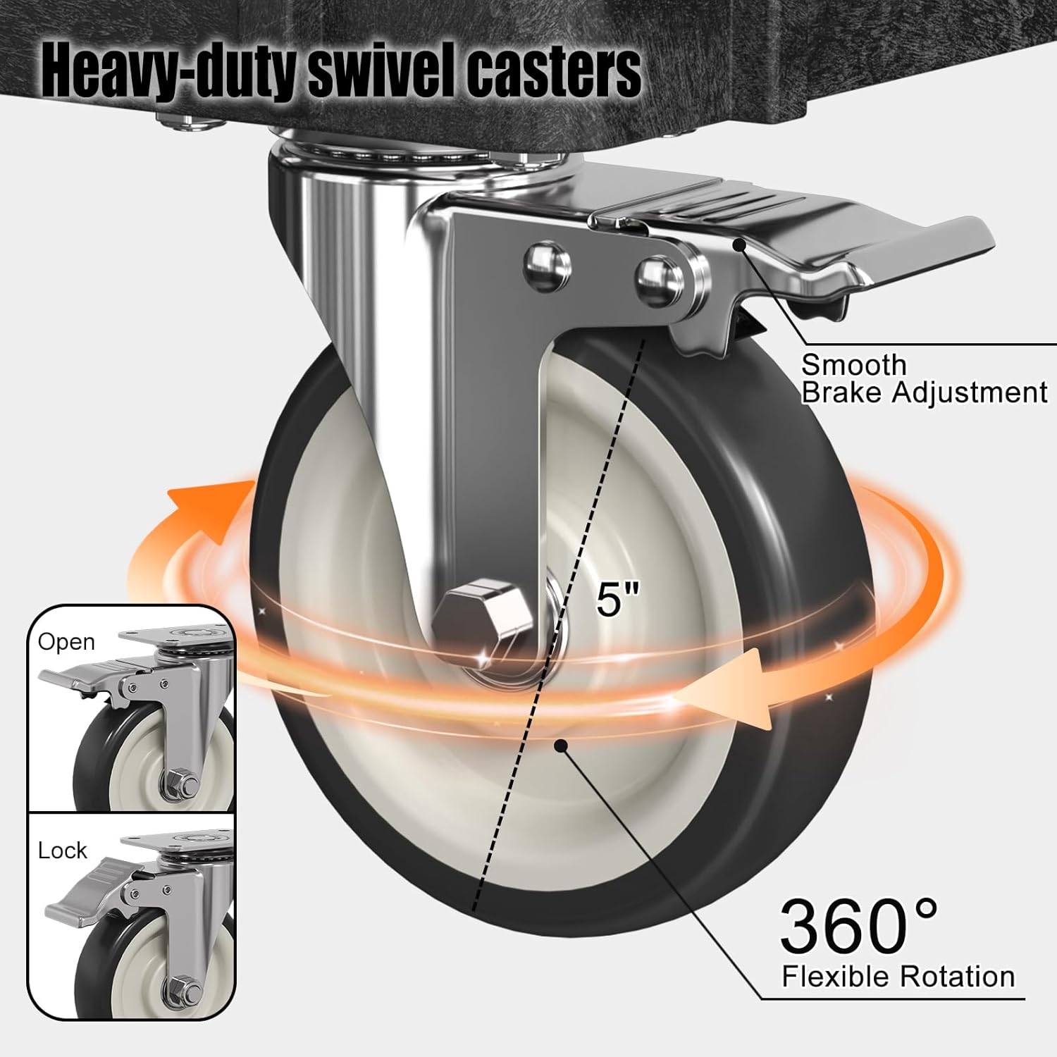 • Effortless Mobility: Equipped with 5-inch swivel casters, allowing smooth and easy movement across different surfaces with minimal effort.