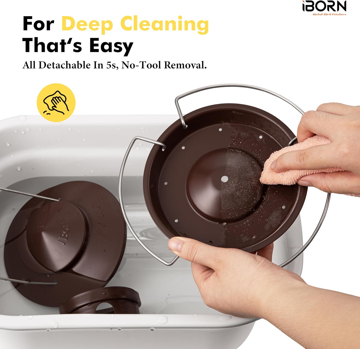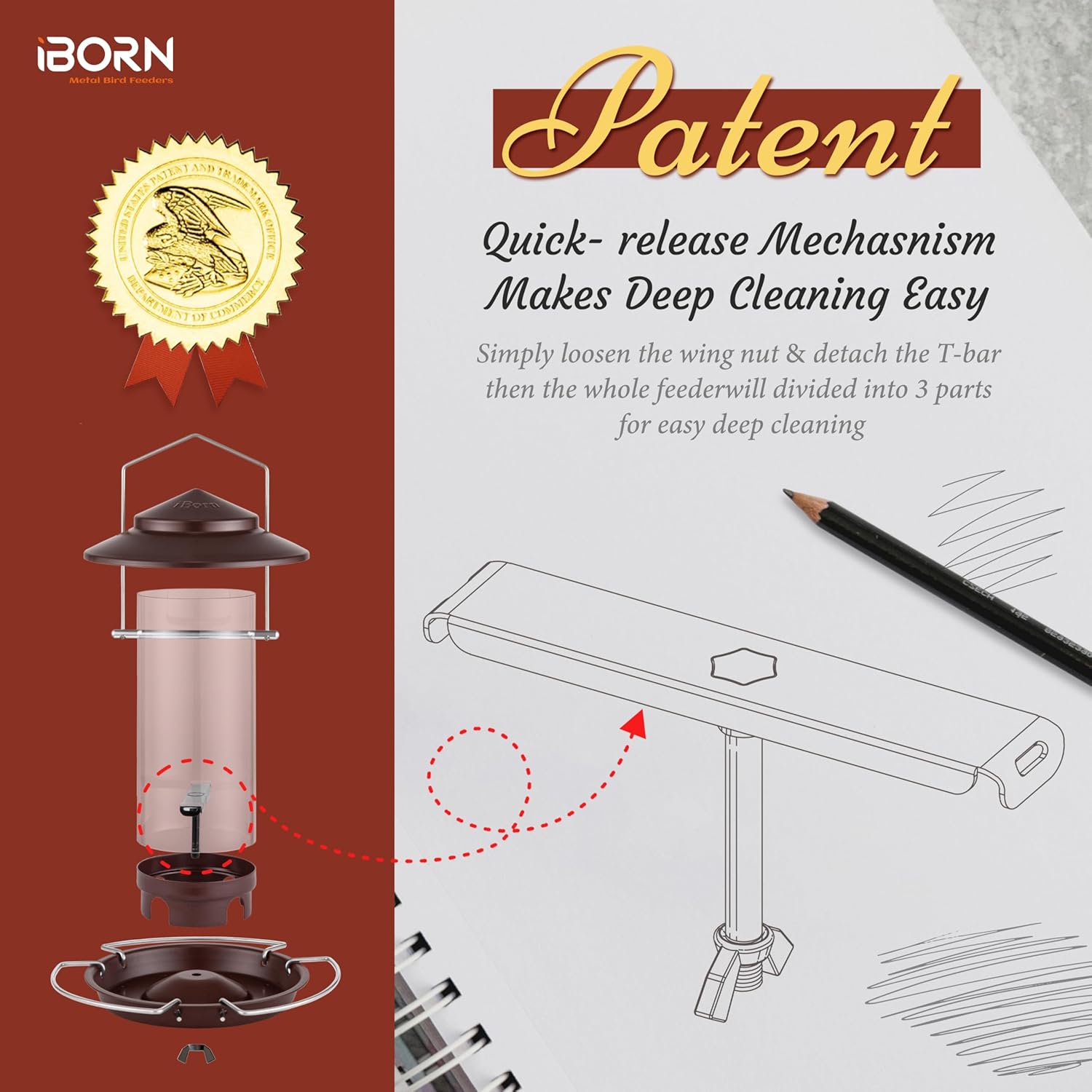 - 【iBorn Patent Design T Bar All Detachable for Easy Cleaning】—No Tools, No Hassle. For deep cleaning, iBorn designed a quick release mechanism for this small bird feeder. Just tighten the wingnut at the bottom,every piece detaches for thorough water cleaning, water effortlessly removes dust and seeds, then gently wipe with a cloth – Like New in Seconds,ensuring fresh, healthy seed for your bird visitors.