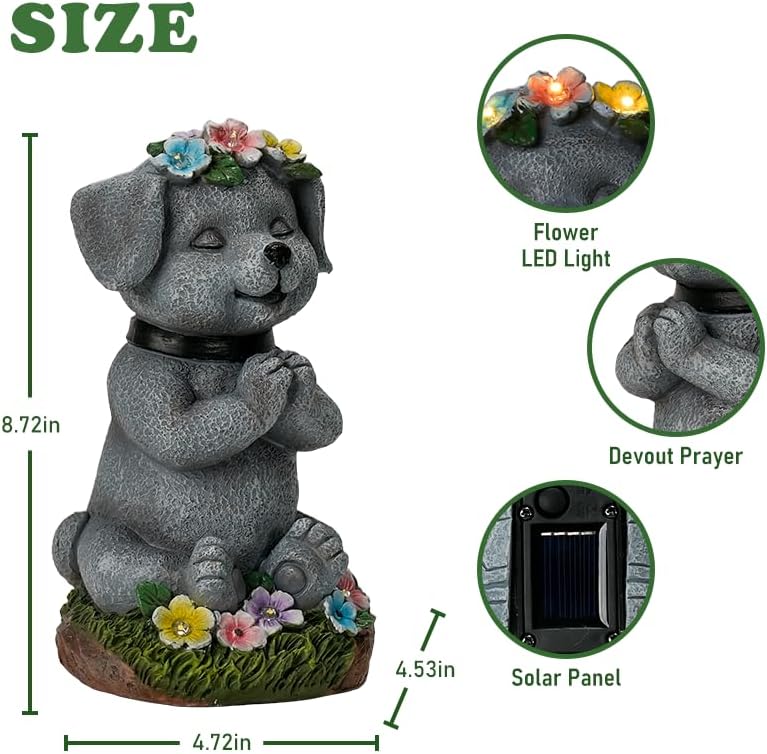 • 【Solar-Powered LED Illumination】Charges automatically in the sun and lights up at night with colorful LED flowers on the puppy’s head and base, creating a captivating, cozy ambiance for your garden, pathway, or patio.