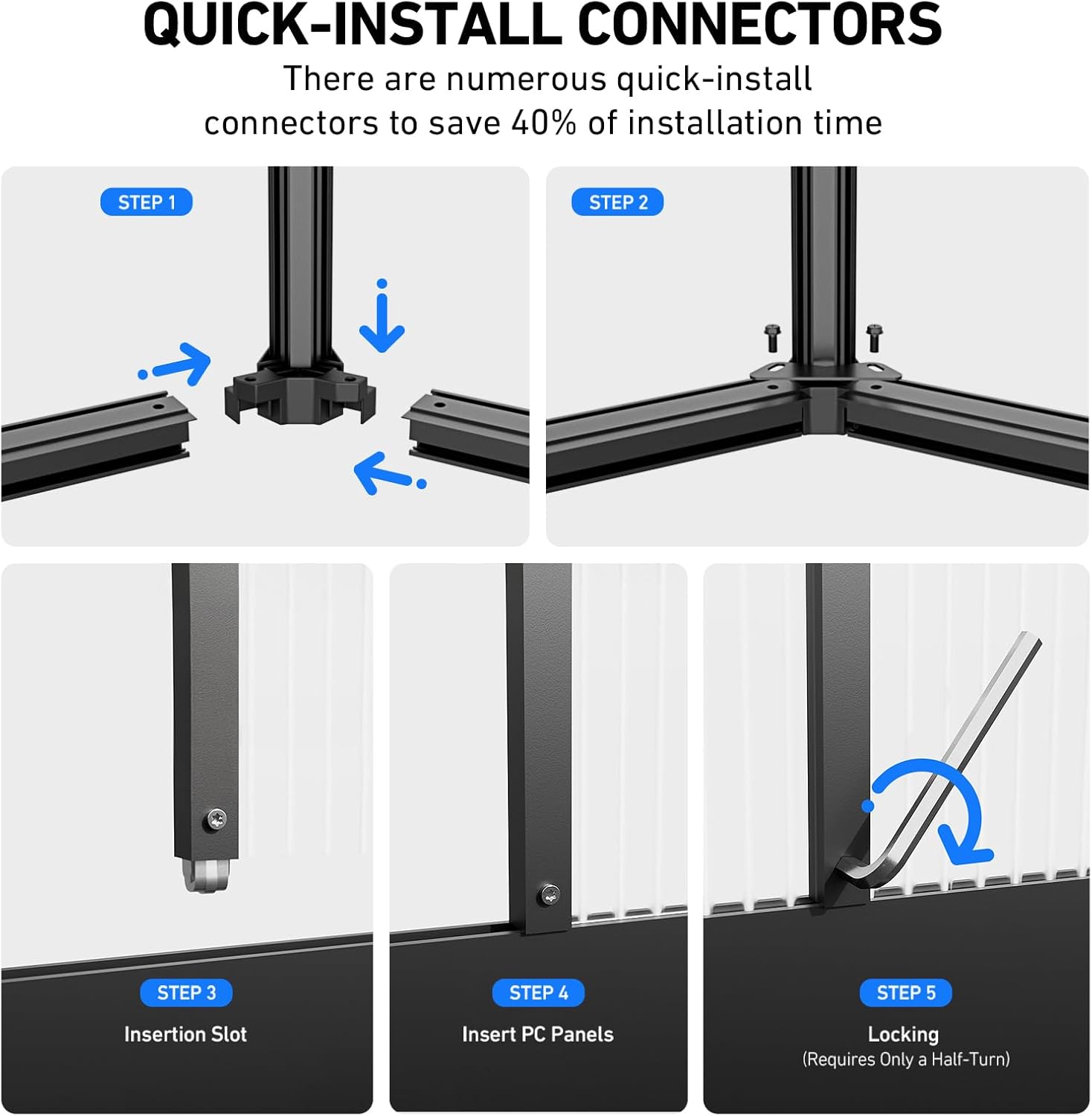 • QUALITY UV RESISTANT PANELS – The 720g PC panels of this green houses for outside that are 4mm thick and twin-wall polycarbonate roof panels are designed for strength and clarity. These shatterproof panels let in just the right amount of light while controlling humidity and temperature in your greenhouse. They effectively block harmful UV rays, creating the great environment for your plants to thrive and preventing sunburn