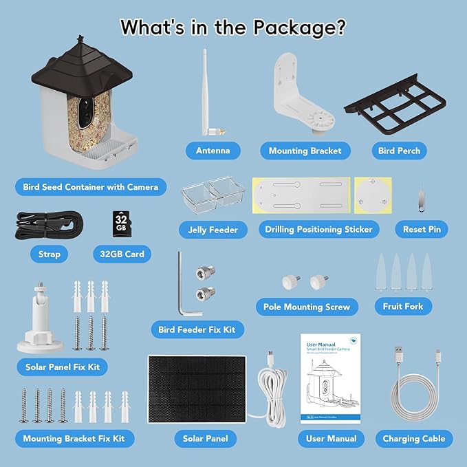 - Special Feature : AI Bird Identification, Real-Time Notifications,Solar-Powered & Battery Dual System,Squirrel-Proof Defense,4K Full-Color Night Vision,Cloud Storage & Memory Card,IP65 Weatherproof, 2L Seed Capacity AI Bird Identification, Real-Time Notifications,Solar-Powered & Battery Dual System,Squirrel-Proof Defense,4K Full-Color Night Vision,Cloud Storage & Memory Card,IP… See more