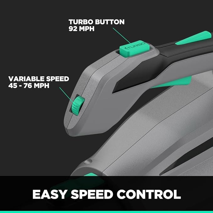 • [Turbo Mode & Variable speed control] Advanced turbo tech allows max air flow at 480 CFM with max speed at 92 MPH, simply by pressing the turbo button. Variable speed control from 45 MPH to 76 MPH by rolling the dial in the front of the rubber-covered handle, suitable for blowing leaves, pine needles, grass clippings, dust, snow, and debris, on decks, pathways, lawns, and gardens.