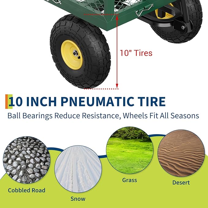 • 900 LBS Heavy Duty Construction: Built with a durable steel frame and a sturdy 43 in x 20 in mesh bed, this garden cart is designed for tough jobs and heavy loads—perfect for transporting soil, tools, plants, and more around your yard or farm