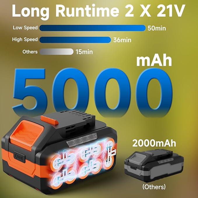 • Upgrade to 2 × 5.0Ah Batteries: Our leaf blower cordless features 2 high-capacity 5000mAh lithium batteries and a fast charger, offering a working time of up to 50 minutes (25 minutes for each battery) on low speed and 36 minutes (18 minutes for each battery) on high speed. The included fast charger fully charges the battery in under 2 hours
