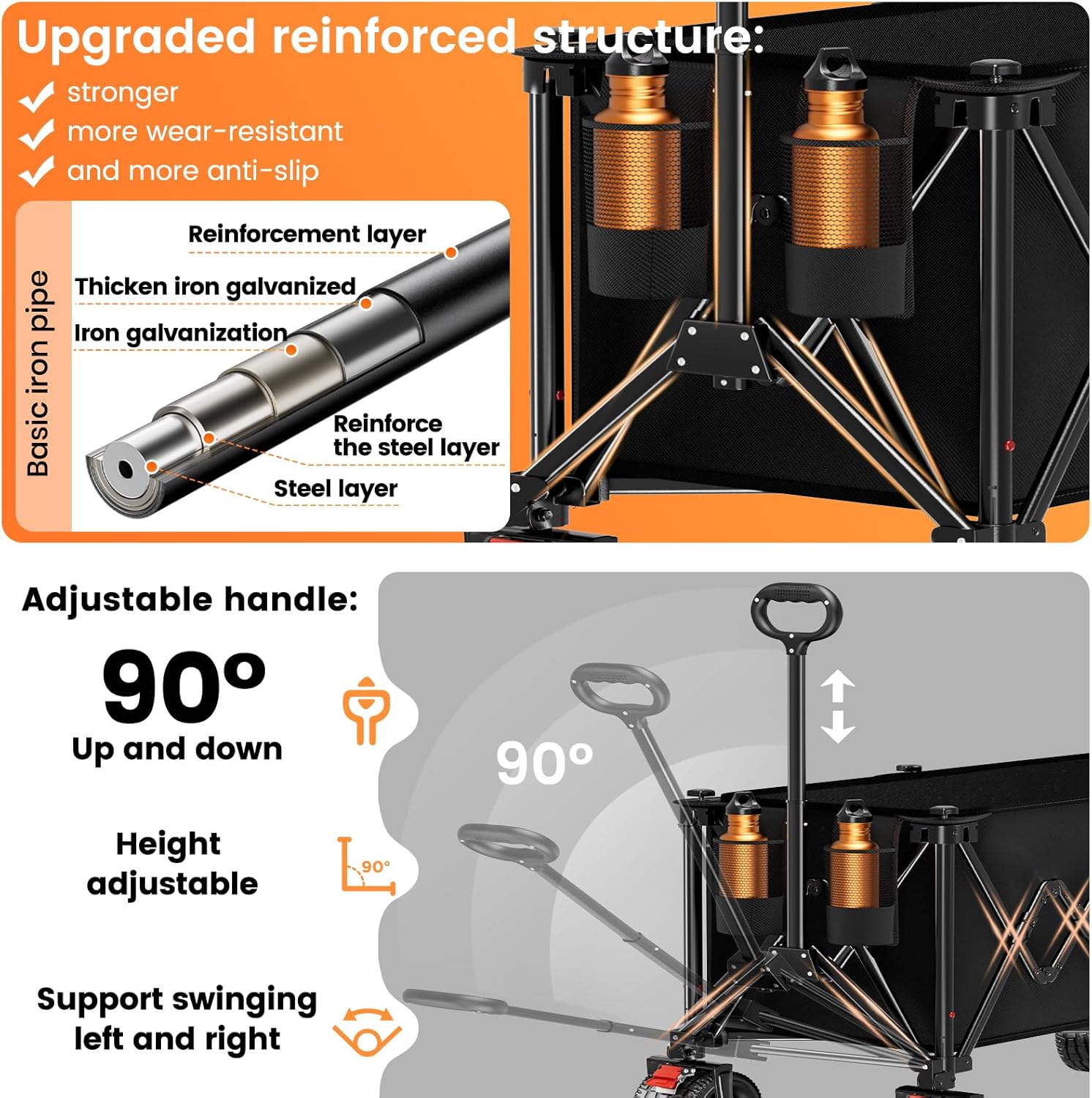 • Havy-duty Steel Frame Structure Design: The folding wagon steel pipes of the frame are 40% thicker than normal steel pipes, patented design--Multi-point balanced load-bearing, ensuring ultra-stability even on rough terrains. And it offers astonishing load-bearing capacity, with both static and dynamic weighing capabilities reaching 550LBS, thus ensuring that the wagon will not deform