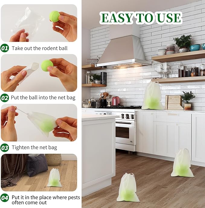 • 【Effective & Powerful】Our mouse repellent is made of super strong essential oils, they can release scent for up to 30 days, the effective area of mouse deterrent balls cover up to 120 sq. ft. Effectively repels Mouse, Roach, Rodent, Mice, Rats, Spider, Ant, other rodents and pests