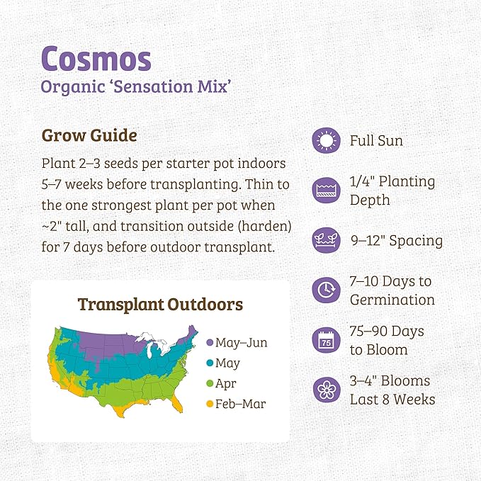 • ORGANIC & NON-GMO: Includes (2) packets of Back to the Roots Organic USDA Certified and GMO Free Heirloom Cosmos 'Sensation Mix' Seeds