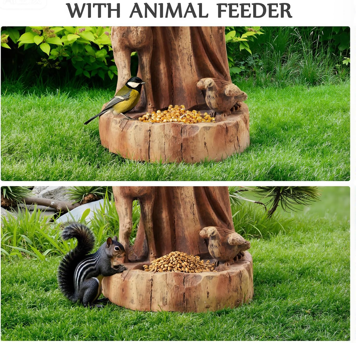 • Great Details: St Francis Statue features a built-in bird feeder, shows St. Francis in his humble robes, often with a gentle smile and open hands, inviting birds to perch.
