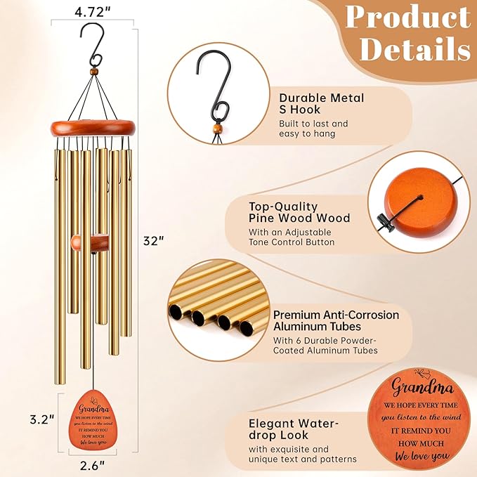 • 【Best Gift for Grandma】To show your strong love for your beloved Grandma, this best grandma gifts wind chime is a heartfelt choice—It brings warm care to your Grandma, gifts for women, gifts for her, 50th birthday gifts for her, 50th 60th 65th 70th 75th 80th 90th birthday gifts for women, reminding her to feel your endless love every time the wind chime rings.