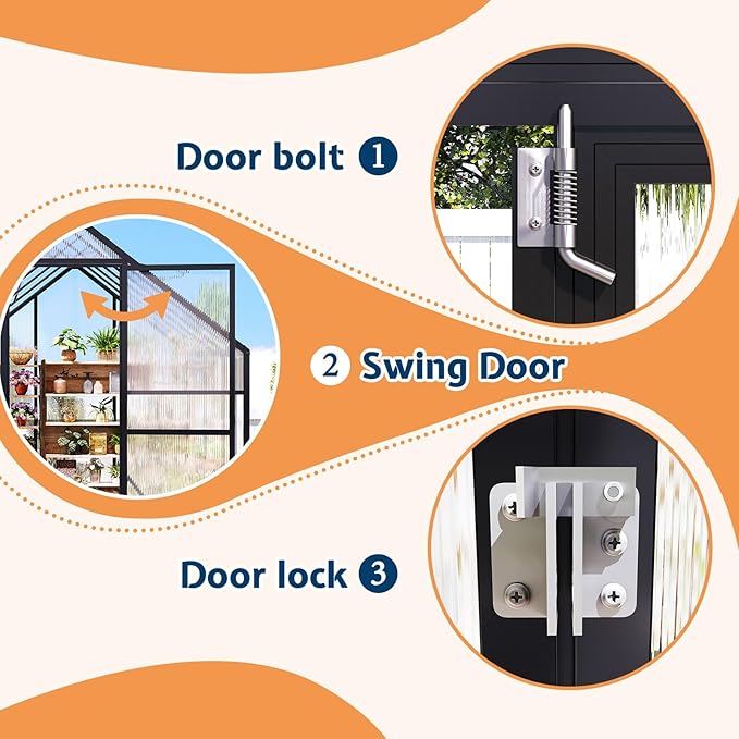 • Polycarbonate Panels: Garden greenhouse is crafted with 4mm semi-transparent panels that block 99.99% of harmful UV rays, providing excellent insulation for your plants.