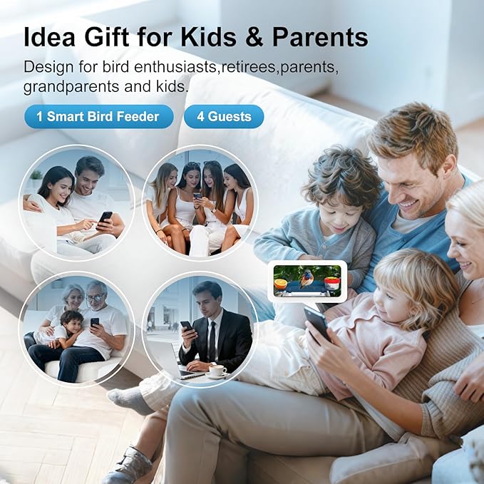 • Birding & Sharing Anytime Anywhere - Bird camera auto detects birds and sends real-time alerts to your phone, so you could stay connected with the birds wherever you are. The bird house with camera also can connect to multiple users at once and provide live on phone with stable 2.4GHz Wifi connection (not fit 5G Wifi). Smart bird feeder with camera supports SD card storage (SD card not included) and cloud storage(30-day trial).
