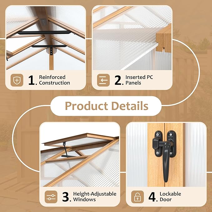 • 【Heavy-Duty Sturdy Frame】 The Besteagle greenhouse features robust base supports and reinforced construction, built from high-quality solid pine timber and premium hardware, further strengthened with an aluminium alloy frame. It is designed to withstand strong winds, heavy rain and snowstorms.