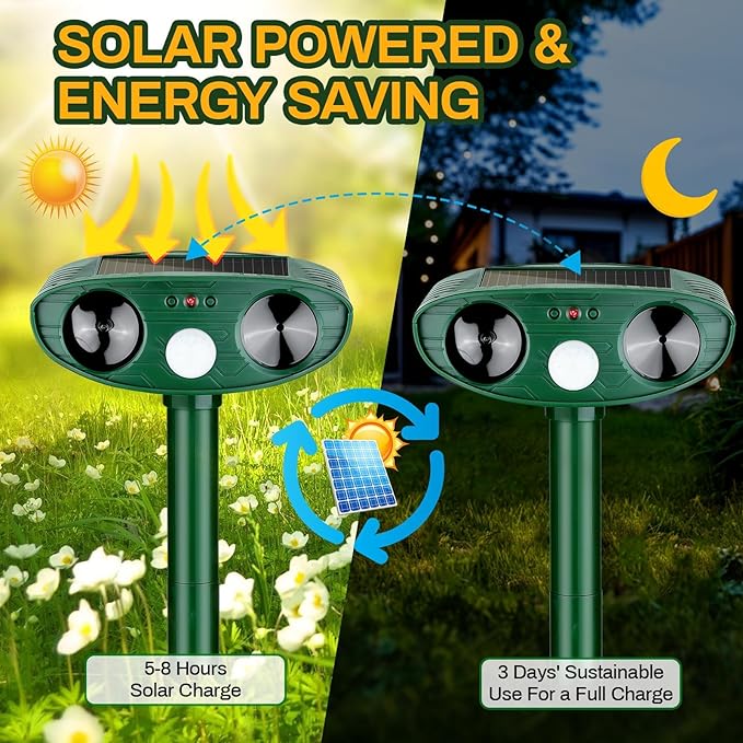 • 【Solar Powered & Energy Saving】 - A high photoelectric conversion solar panel is placed on its top, and it can be charged by the solar panel under the sun. Additionally, once turned on, when the PIR sensor detects motion, the red-LED light will light up. The ultrasonic signal will operate for 15 seconds. If no new movement is detected, the repeller will return to stand-by mode, thus saving more energy.