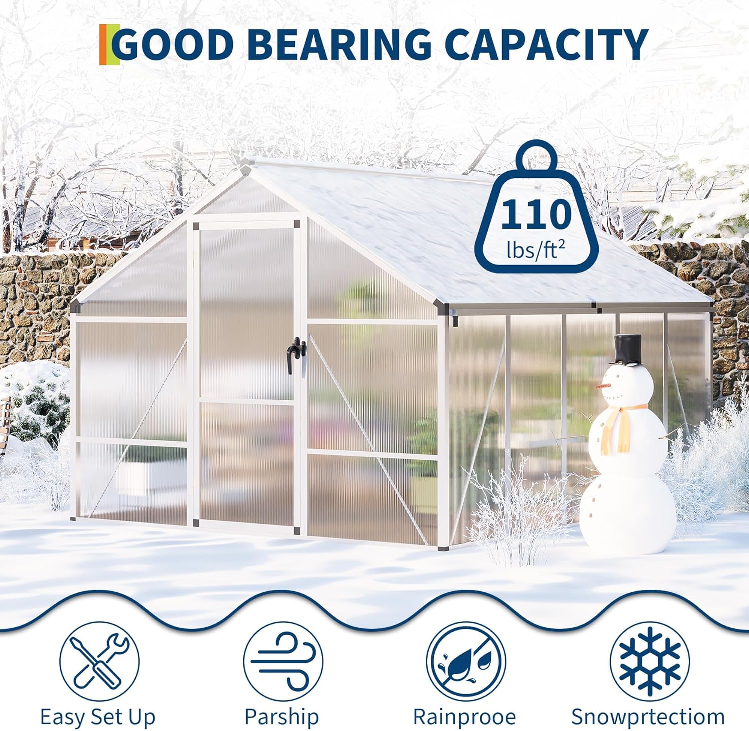 8x10 ft Greenhouse for Outdoors, Polycarbonate Greenhouse with Roof Vent, Ground Nails, Lockable Push Door, Aluminum Large Walk-in Green House for Outside Garden Backyard, Patio, Lawn, Silver