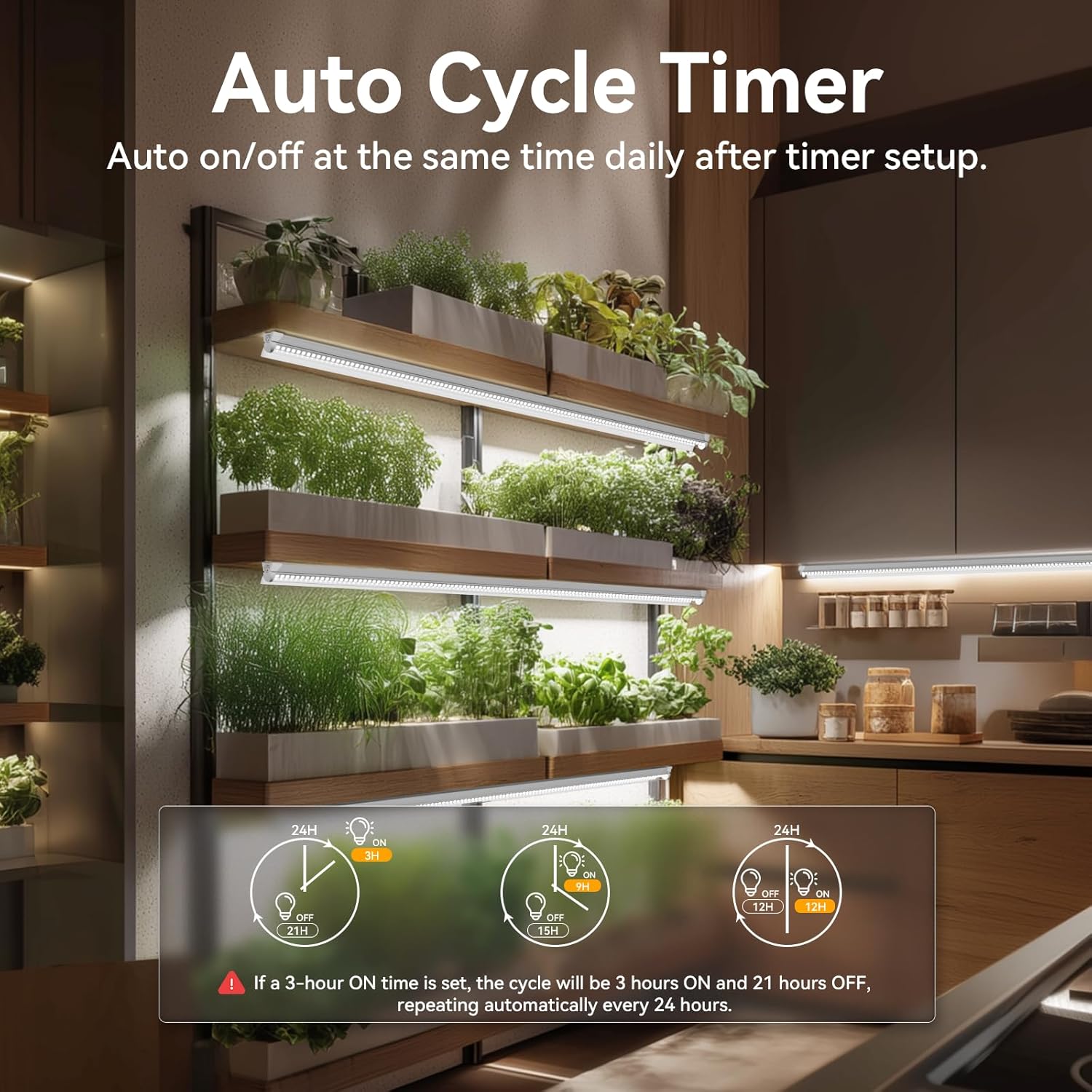 • 【Aluminum Grow Ligh with Timer】Crafted from premium aluminum for high-efficiency heat dissipation, this grow light ensures a longer LED lifespan. It features a built-in timer with 6/9/12-hour cycle options. For example, a 3-hour setting means the light stays on for 3 hours and off for 21 hours, auto-repeating every 24 hours.