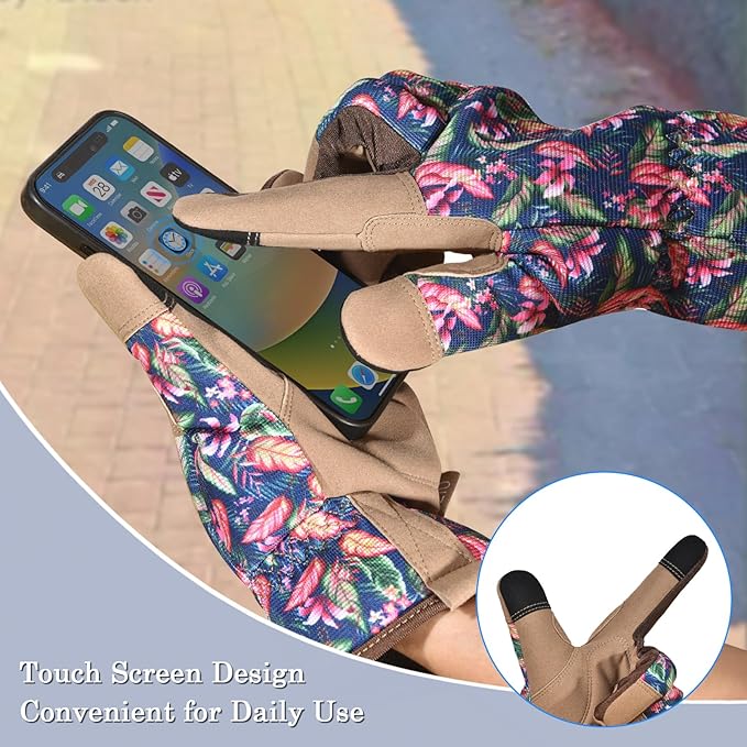• BRIGHT FLORA PATTERN: Bright flora pattern printed on the back of the garden gloves, adding more fun to garden life. The thumb and index finger areas are made with the type of material that allows you to use touch screen electronic devices without removing the gloves during busy work.