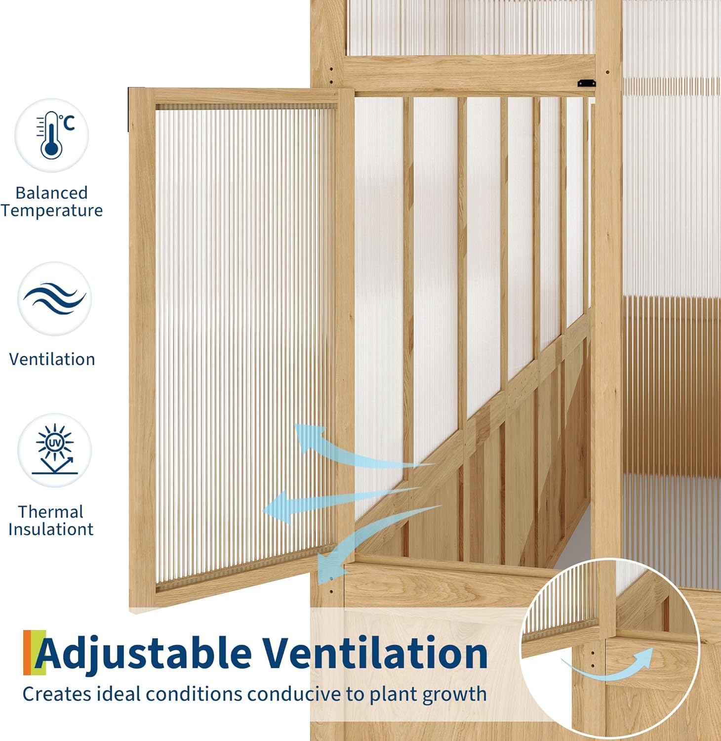 • 【Heavy Duty and Strudy Frame】Wood greenhouse are constructed using high-quality pure fir wood and premium hardware, reinforced with an aluminium alloy frame.This rugged structure ensures stability and durability even during strong winds and heavy rains, keeping your plants protected and thriving long-term