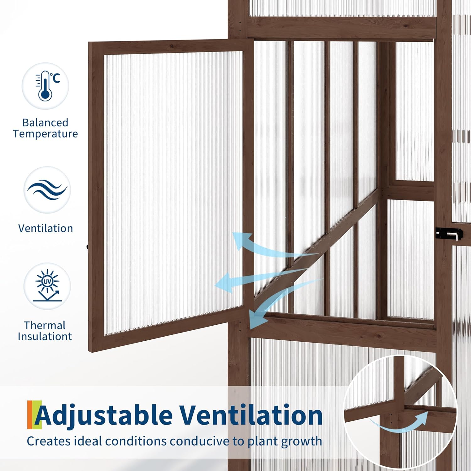 • 【Heavy Duty and Strudy Frame】Wood greenhouse are constructed using high-quality pure fir wood and premium hardware, reinforced with an aluminium alloy frame.This rugged structure ensures stability and durability even during strong winds and heavy rains, keeping your plants protected and thriving long-term
