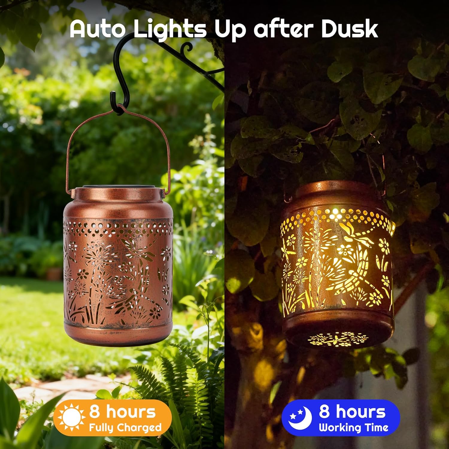 • 【Beautiful and Exquisite Garden Decoration】Beautiful gold copper color matches a retro appearance, this solar lantern features an intricate hollow design that makes the lively dragonflies appear to be flying around, making the night relaxing and cozy, with a warm and peaceful atmosphere. Whether hanging this garden decoration on trees, shepherd's crooks, or placing it on the courtyard, porch, pathway, sidewalk, terrace, balcony is a cute and fun decoration.