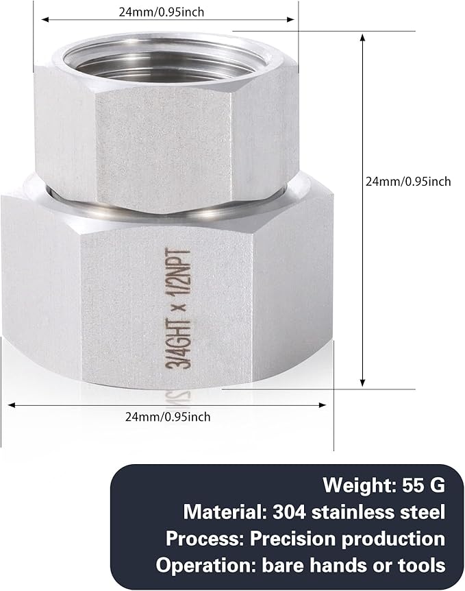• Size: 3/4" GHT female thread x 1/2" NPT female thread, converts tapered pipe thread to garden hose thread. Note: The actual diameter of 1/2" NPT thread is 0.84 inches, and the actual diameter of 3/4" GHT thread is 1.05 inches. GHT and NPT are two different thread types; please confirm the size before purchasing.