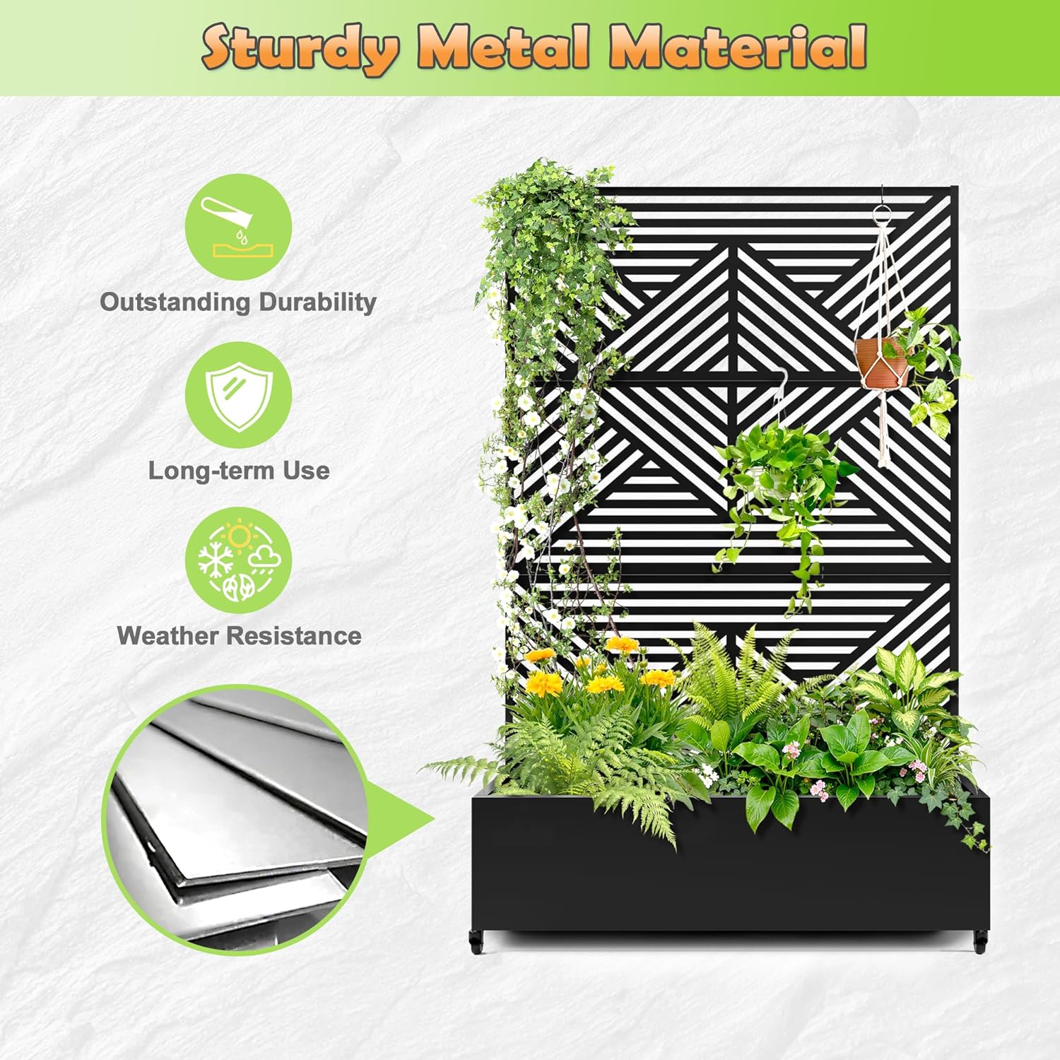 • Space-Saving Design: The planter box is combined with the trellis to provide a space-saving and aesthetically pleasing gardening solution. The vertical design of the trellis maximizes the planting area while maintaining a compact footprint. The outdoor raised garden bed’s vertical design is ideal for people with limited space to build a beautiful garden on a terrace or in a small yard.