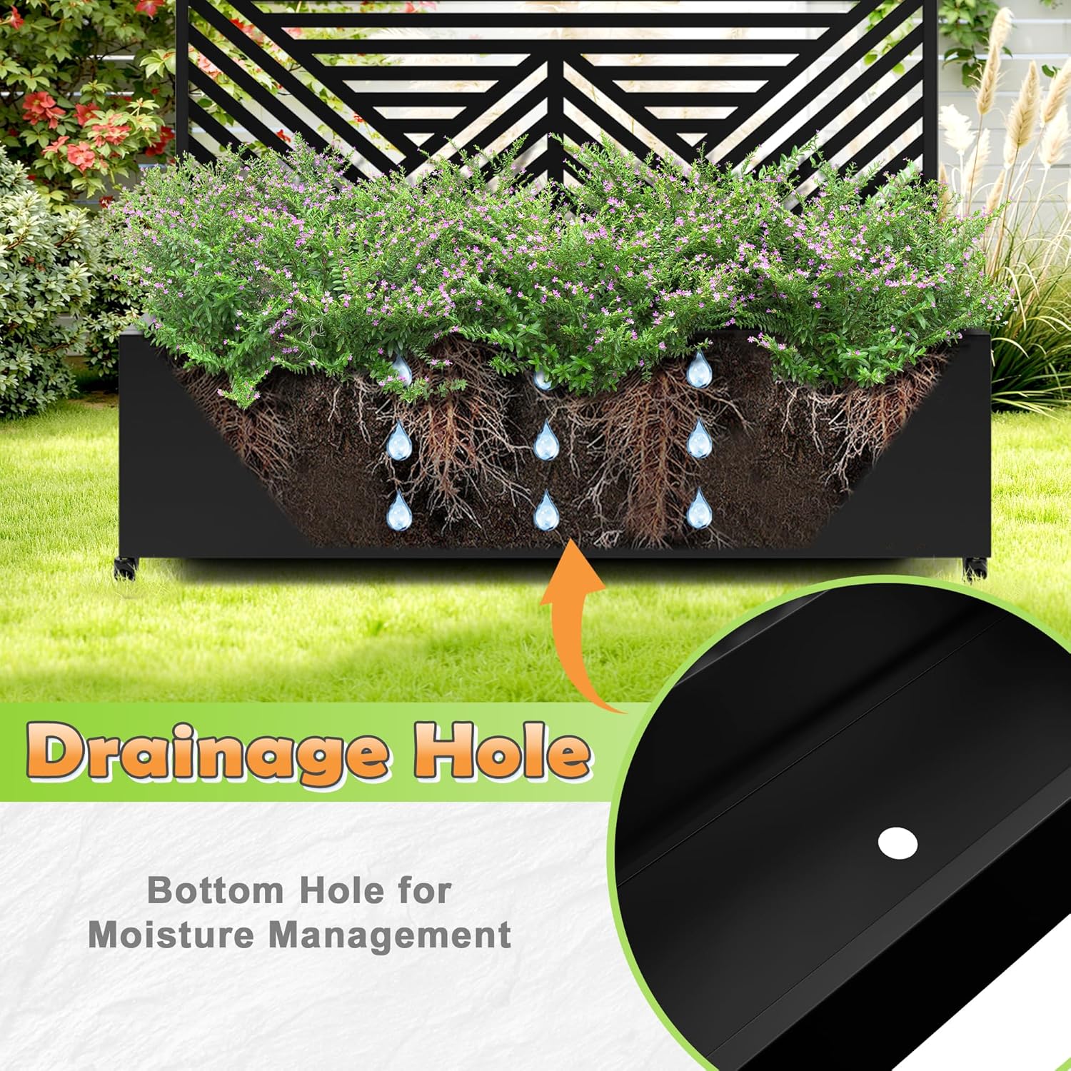 • Optimal Water Management: The planter with trellis is designed with a certain depth planting bed, providing ample space for root growth. The raised garden bed also includes built-in drainage holes that effectively prevent waterlogging, ensuring your plants receive the right amount of moisture for healthy development.