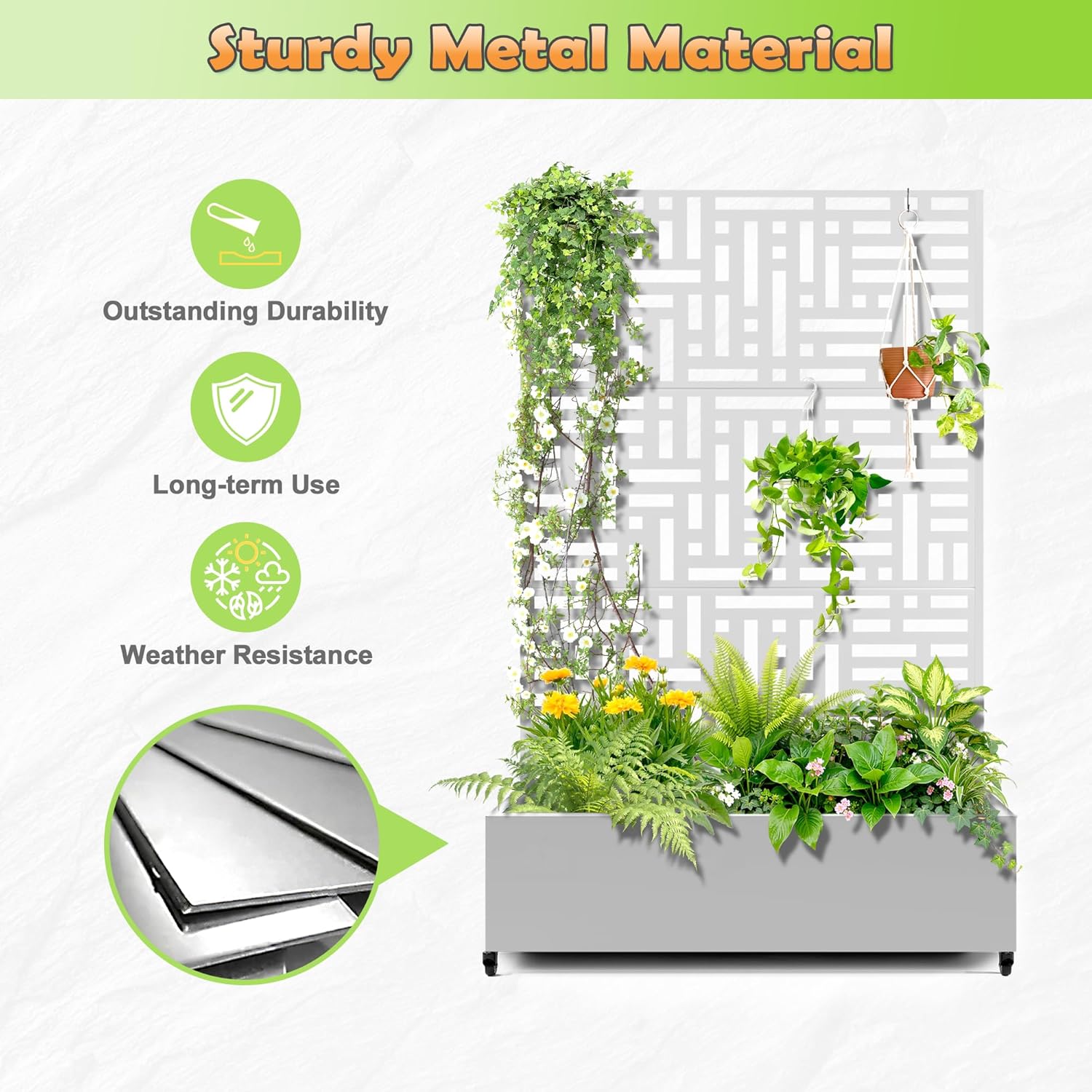 Metal Raised Garden Bed with Trellis, 2-in-1 Planter Box & Privacy Screen for Climbing Plants, Outdoor Standing Flower Bed with Drainage Holes, 47.2" L x 16.7" W x 70.8" H, White-Helen
