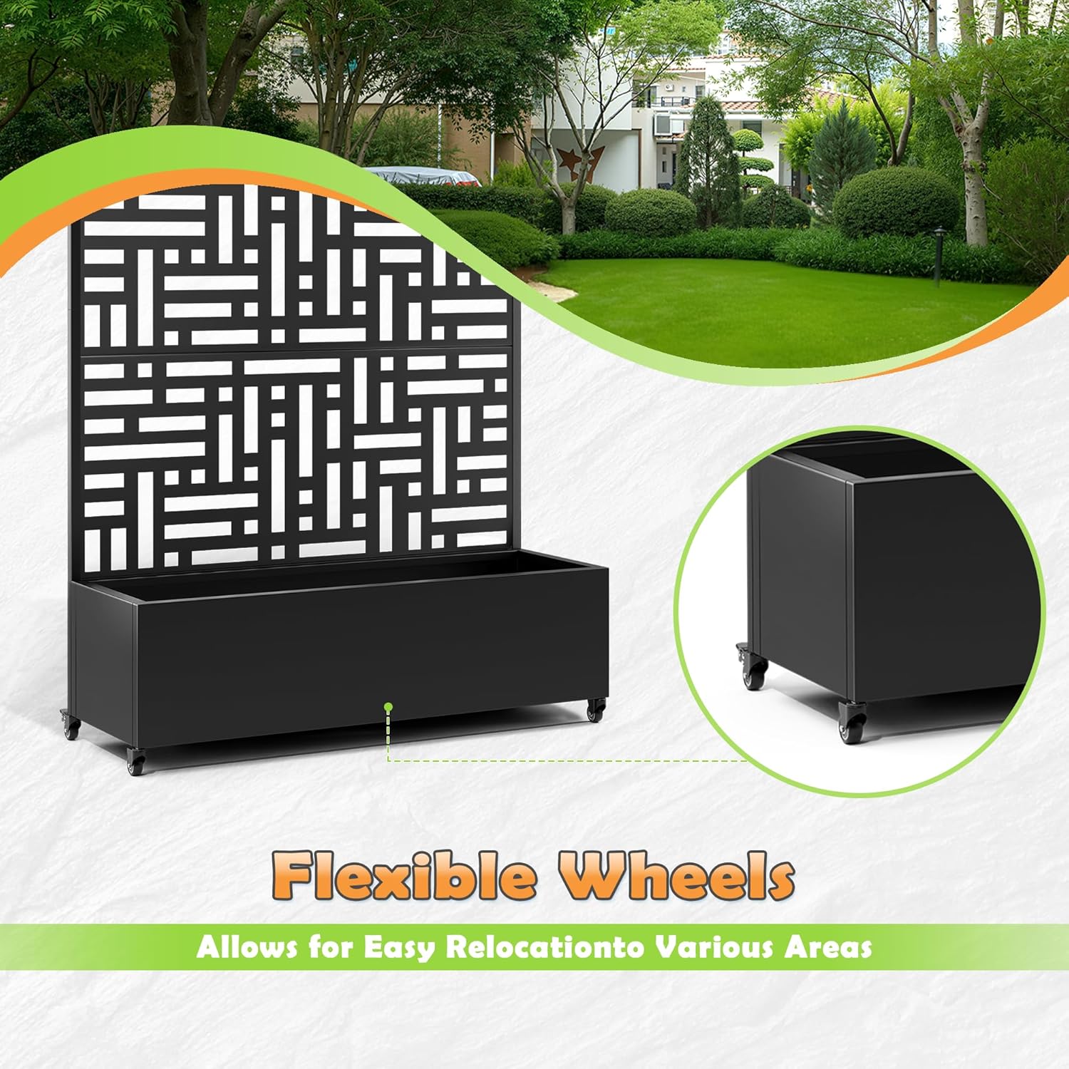• Smooth-Rolling Wheels: Equipped with four smooth-gliding wheels, this garden bed can be moved effortlessly to follow the sun or refresh your patio layout. Whether you're shifting it for better light or seasonal changes, the garden bed rolls with ease and flexibility.
