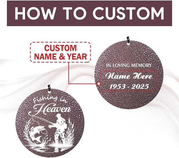 • ๐Ÿ’™Personalized Wind Chimes: With a fishing enthusiast caught a big fish and some words like "fishing in heaven" printed on the one side of catcher, another side of catcher is customized the name&date you want. Memorial condolences gifts for Loss of Loved Grandpa/Dad/Friends loves Fishing.