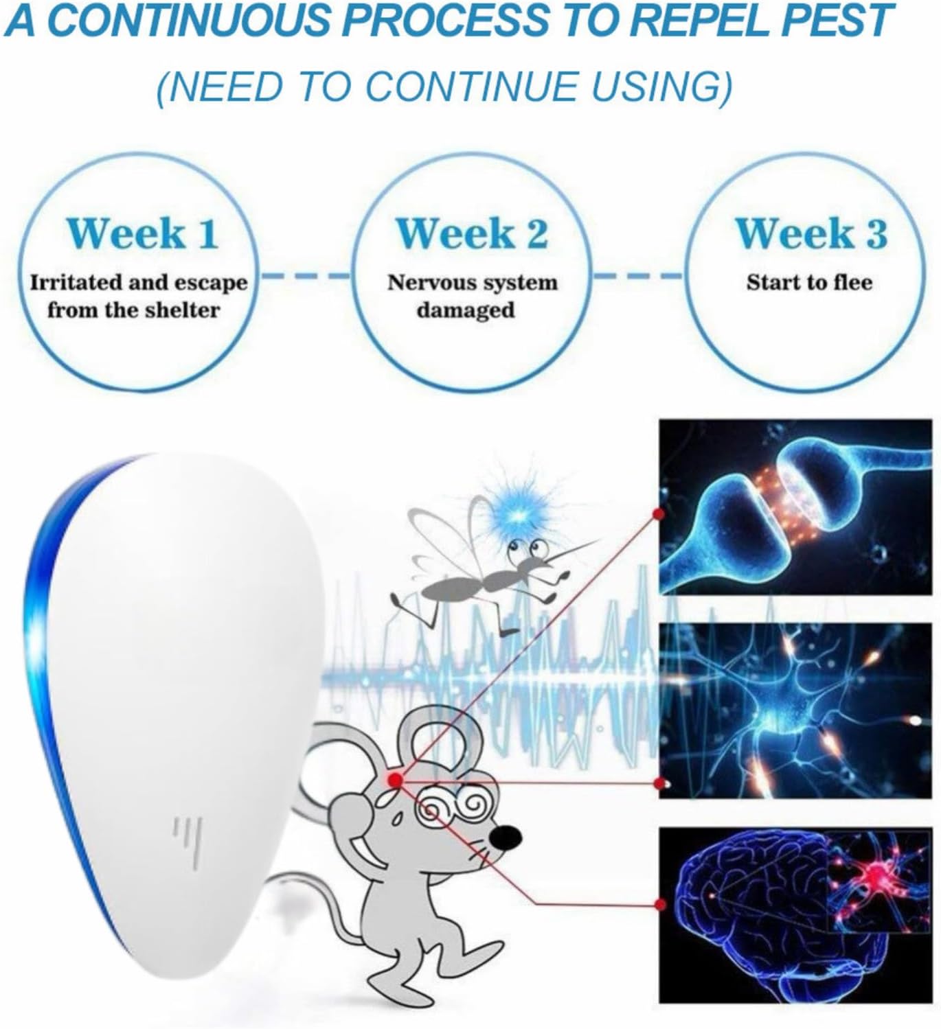 • Easy to Use: simply plug in the rat repellent indoor ultrasonic into a power outlet; the blue light indicates that the device is active and repelling pests; for flying pests, place it 30-50 inches high; for crawling pests, position it 10-30 inches from the ground