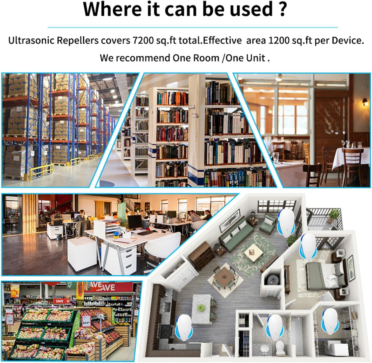 • Wide Coverage : It is effective up to an area of 1600 SQ; put one in each room as ultrasound can not penetrate through walls and solid objects spaces such as garages, kitchens, attics, barns, and RVs