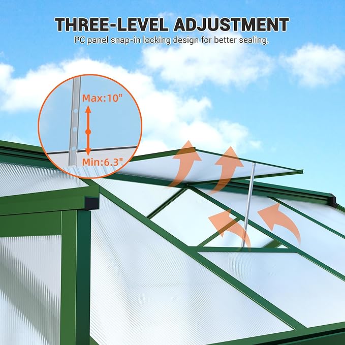 • Quick Slide-In Assembly System: Features thicker polycarbonate panels and robust aluminum frame with pre-designed sealing slots. This greenhouse kit assembles in hours without tools - much faster than traditional greenhouses with complicated setups.