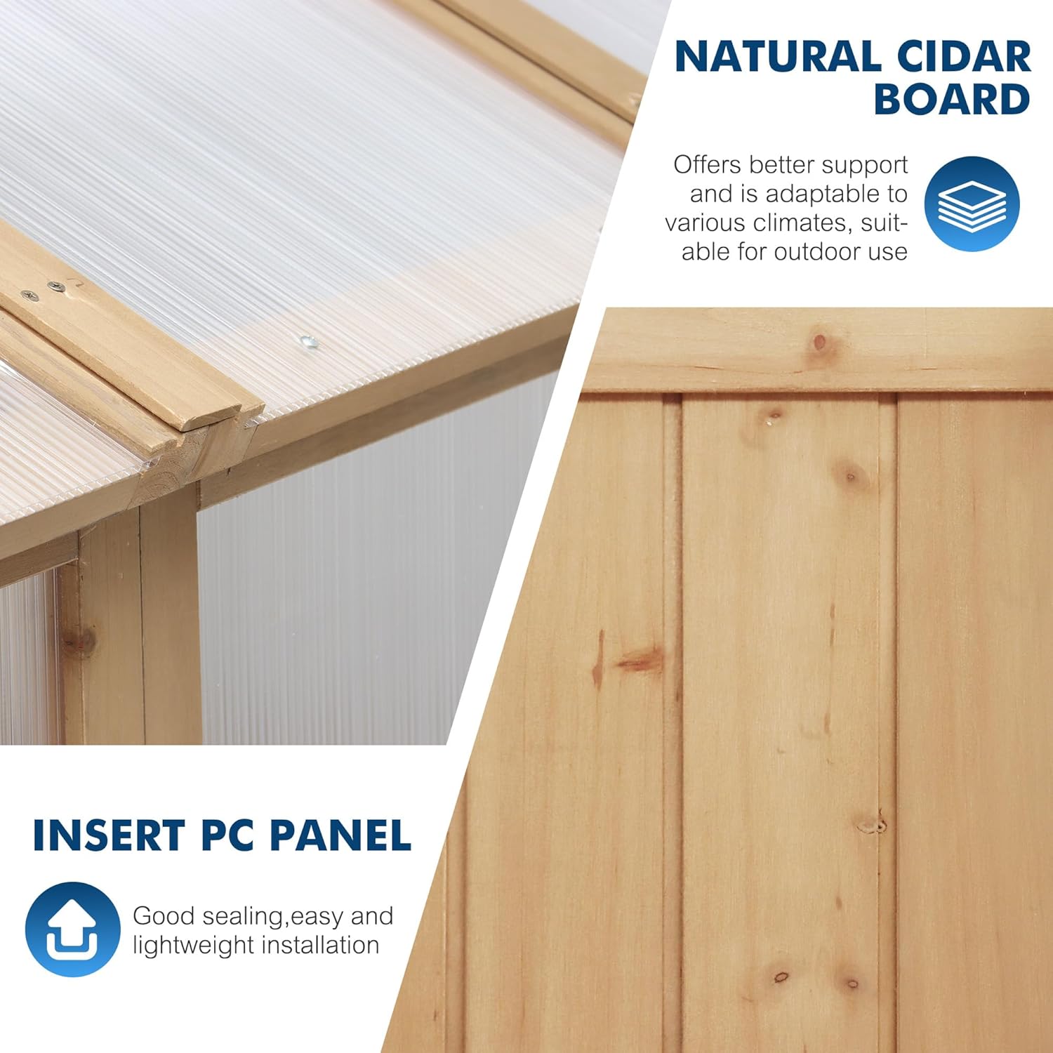 • 【Reinforced Cedar Frame】Outdoor greenhouse triangular support design at both the top and sides disperses pressure in all directions, providing greater load-bearing capacity when encountering heavy snow accumulation while also offering enhanced stability during high winds.