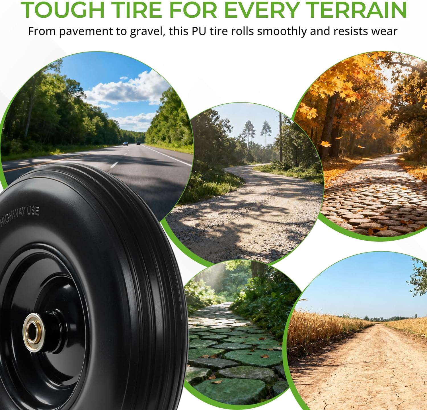 • AVAILABLE IN 10", 13" & 16" SIZES – Flat-free solid polyurethane (PU) tires deliver smooth handling and zero maintenance—no air, no leaks, no flats. Choose from 10", 13", or 16" options to perfectly fit your wheelbarrow, garden cart, hand truck, and more