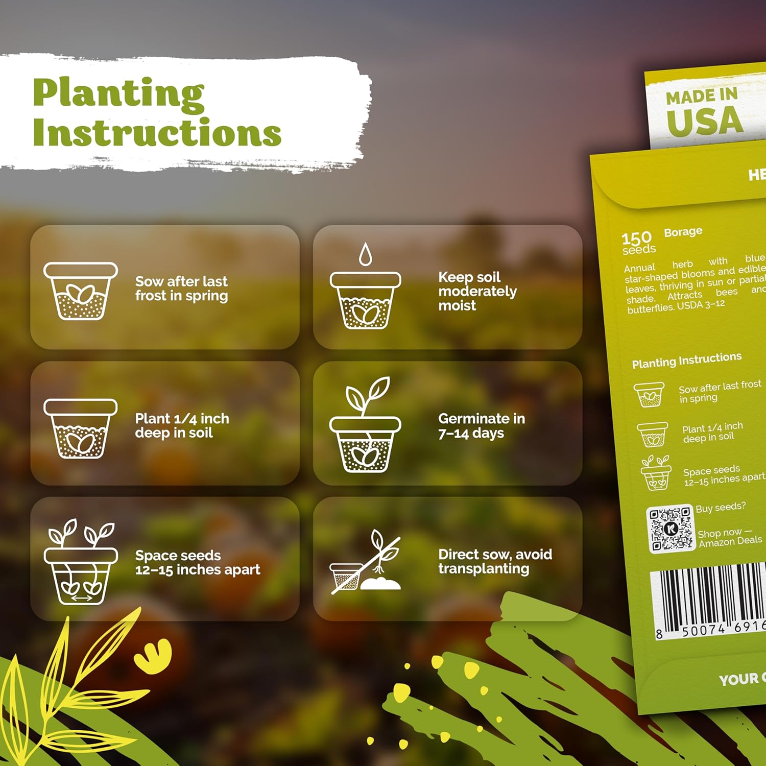 • Quick, Reliable Start: Germination in 7-14 days at 59-77°F. Heirloom borage seeds thrive with moderate watering and mulch to keep foliage dry. Borage seed is ideal option for outdoor & indoor herb garden, low-fuss gardens.