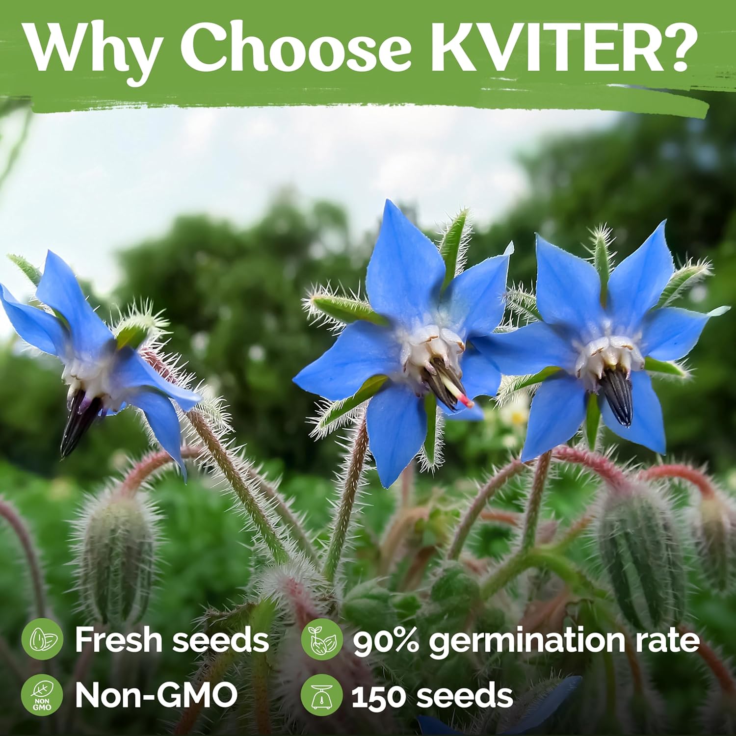 KVITER 150 Borage Seeds (Borago officinalis) - Blue Strawflower, Edible Flower for Teas, Attracts Pollinators - Organic & Heirloom Herb Seeds for Planting in Outdoor & Indoor Garden, Beds, Containers