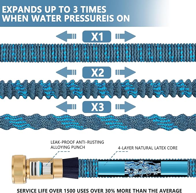 • Upgrade material Ultra-durable expandable garden hose: Covered with high density 3750D polyester ultra strong fabric, precision crafted with 4 layers latex inner tube and solid brass connector. Designed to withstand water pressure up to 180psi, ensuring reliability in a variety of environmental conditions.