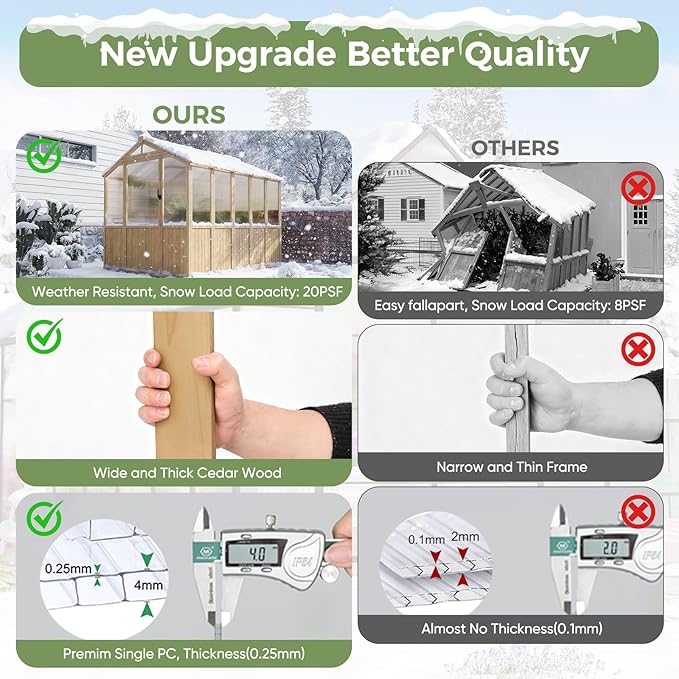 • ๐ŸŒปSturdy Wood Frame: Built from premium cedar and reinforced with metal hardware, this wooden greenhouse boasts exceptional durability. It can withstand winds of 38 mph and support snow loads of up to 20 PSF, ensuring reliable stability in diverse weather conditions