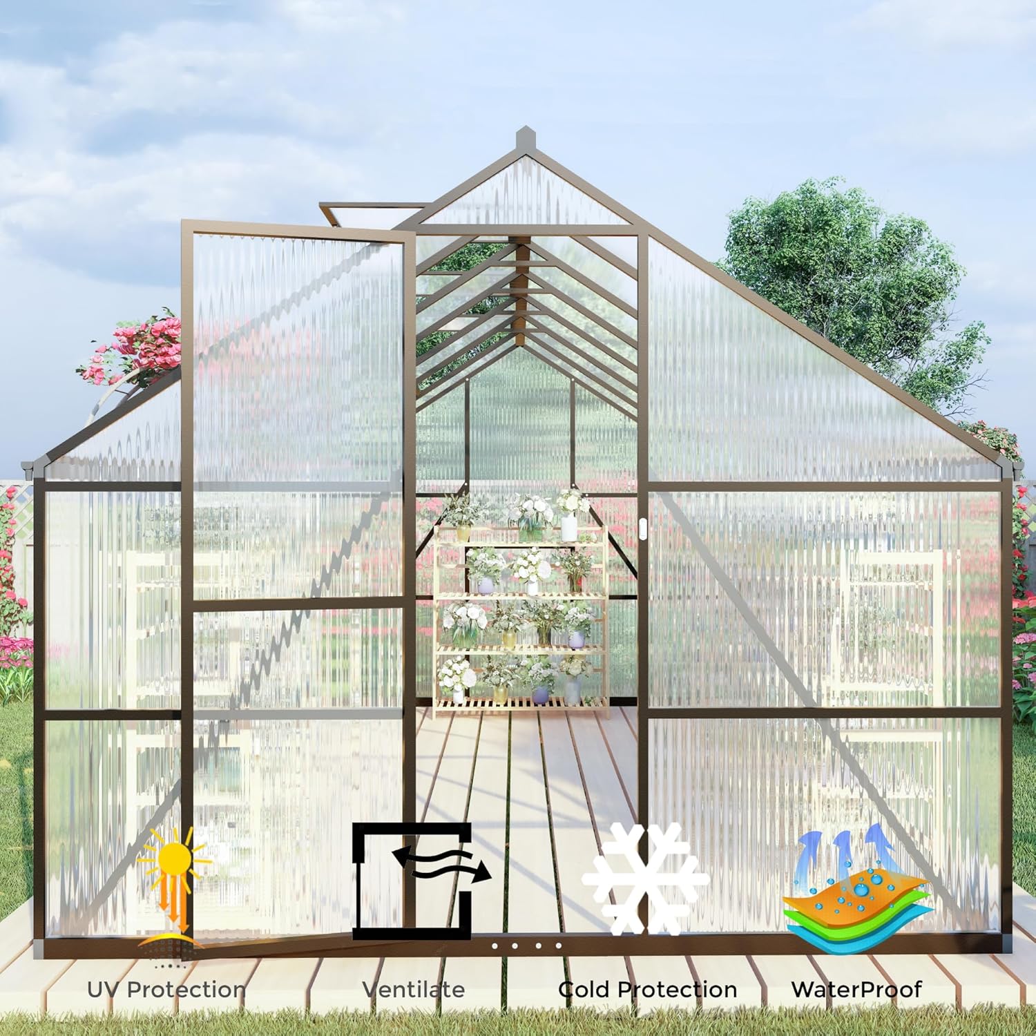 • 【UV Guard】Our green house is equipped with panels that have a UV coating on their surfaces, ensuring your plants are protected from harmful solar radiation while maximizing sunlight exposure. This optimal balance supports healthy growth and the flourishing of vibrant blooms.