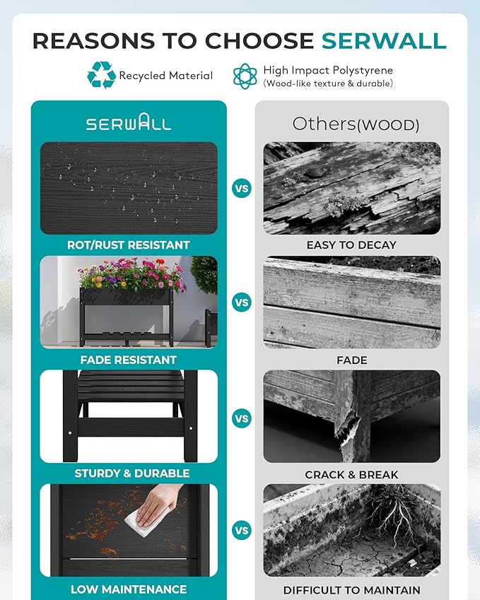 • HDPE MATERIAL- Made from 100% HDPE material, SERWALL outdoor raised garden bed offers high strength and stability, ensuring a long service life. SERWALL raised bed is durable for outdoor use in any weather condition.