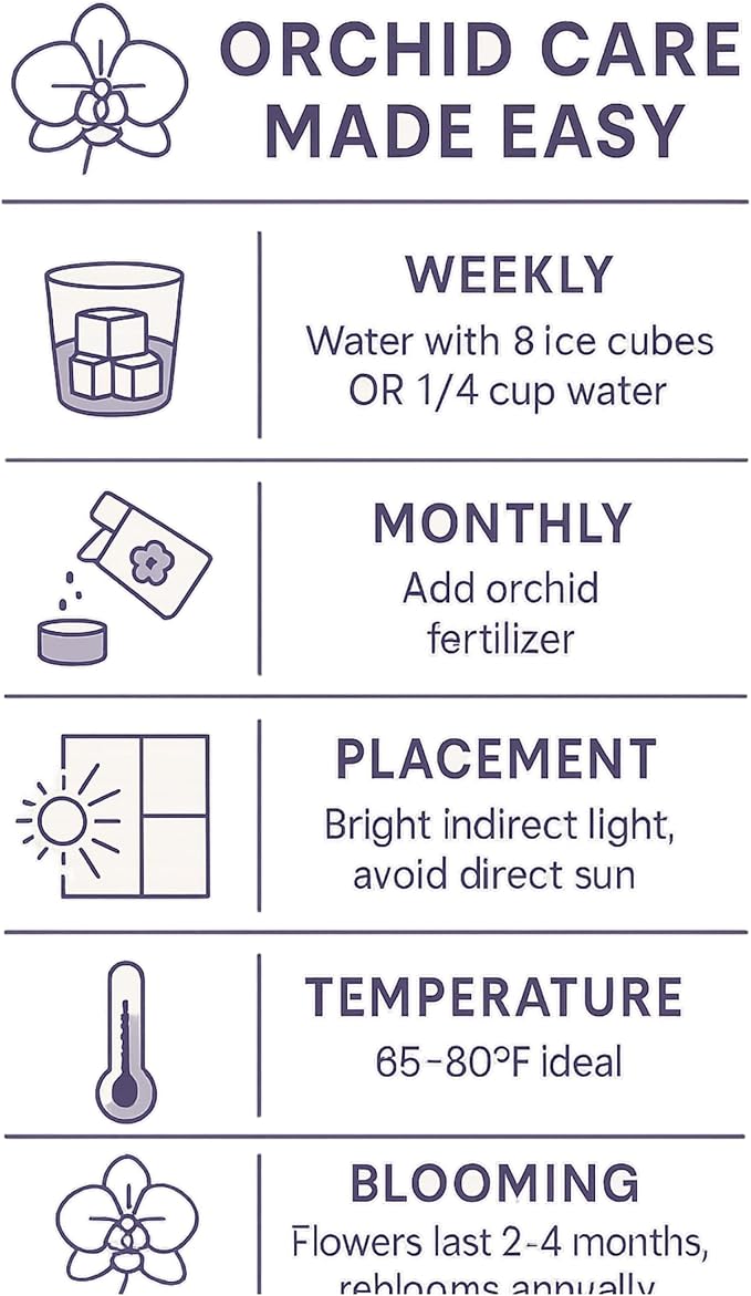 • Product Care Instructions : Bright, indirect light. Water sparingly (ice cube method or 2-3 tbsp weekly). Avoid direct sun. Ideal room temp: 65-80°F Bright, indirect light. Water sparingly (ice cube method or 2-3 tbsp weekly). Avoid direct sun. Ideal room temp: 65-80°F