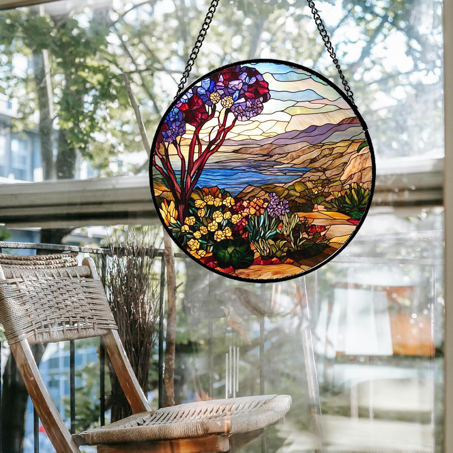 Stained Glass Window Hanging Retro Wildflowers Lake Mountain Scenery 9.8" - Suncatcher Door Garden Sun Catcher Home Decor Birthday Christmas for Mom Men Woman Friend