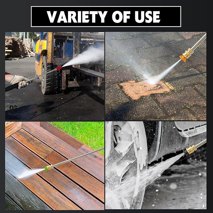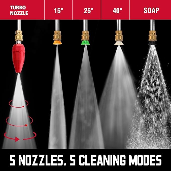 • 5 Spray Tips Included – For All Surface Types – Comes with 15°, 25°, 40°, foam, and lotus-shaped fan spray nozzles, this pressure washer handles every cleaning need, from heavy grime on walls to gentle foam for outdoor furniture.
